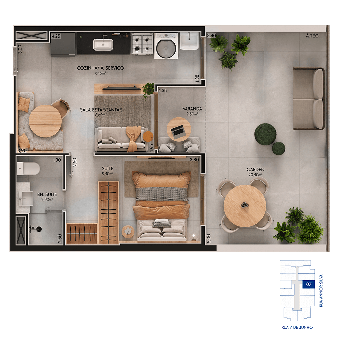 01, 02 e 03 quartos, studios, área de lazer completa e hub de inovação integrado.