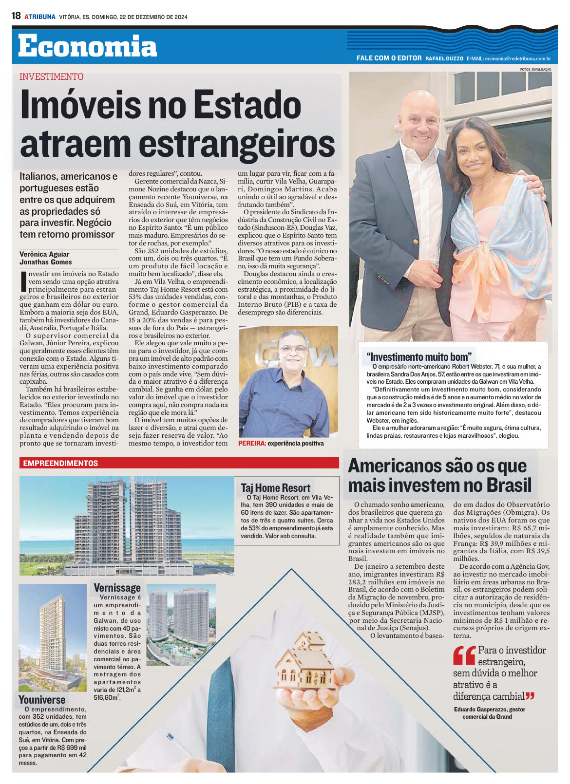O empresário norte-americano Robert Webster, 71, e sua mulher, a brasileira Sandra Dos Anjos, 57, estão entre os que investiram em imóveis no Estado. Eles compraram unidades da Galwan em Vila Velha.